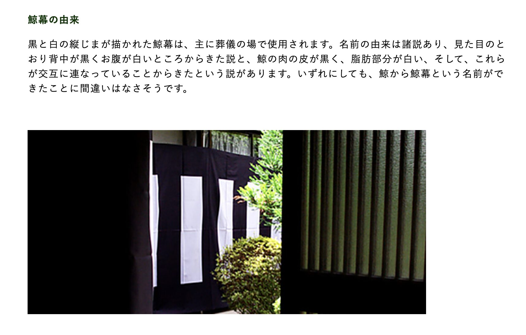 黒と白が交互に並ぶこの幕は、古くは御神事で使われていたものが、葬儀の場で使われるようになり、それがいつしかクジラ幕と呼ばれるようになりました。